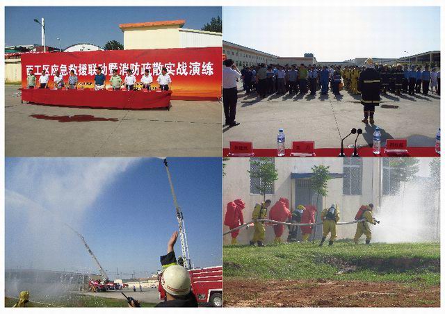 洛陽市安監(jiān)局領導、洛陽市消防支隊領導、區(qū)領導迅速趕赴現(xiàn)場指揮救援,8臺消防車、2臺救護車在公安交警車開道下呼嘯而至,120名消氣防戰(zhàn)斗員訓練有素展開救援,生產調整組、安全環(huán)保組、警戒保衛(wèi)組、設備搶修組、信息管理組共50人分別按預案井然有序開展現(xiàn)場工作。由于反應迅速,處置得當,沒有造成周圍水體、空氣環(huán)境污染,沒有發(fā)生其他次生事故,1名中毒的現(xiàn)場操作人員得到及時救治。本次演練為力求貼近實戰(zhàn),對突發(fā)事故應急處理真正起到指導和演練作用,改變以往演練模式,應急指揮部演練中還臨時增設了演練科目。