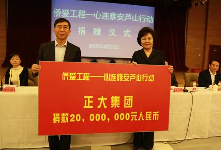 2013年4月20日8時02分,四川省雅安市蘆山縣發(fā)生7.0級地震。消息傳來,舉國震動。中國人民心連心,一方有難八方支援,全國人民與雅安人民站在一起。社會各界紛紛伸出了援助之手,對災區(qū)進行了各種形式的捐助、支持與幫助。4月23日,正大集團為雅安地震災區(qū)捐款人民幣2000萬元,集團(北京)董事長辦公室楊海浩總裁代表集團出席國務院僑辦舉行的“僑愛工程——心連雅安蘆山”行動捐贈儀式。