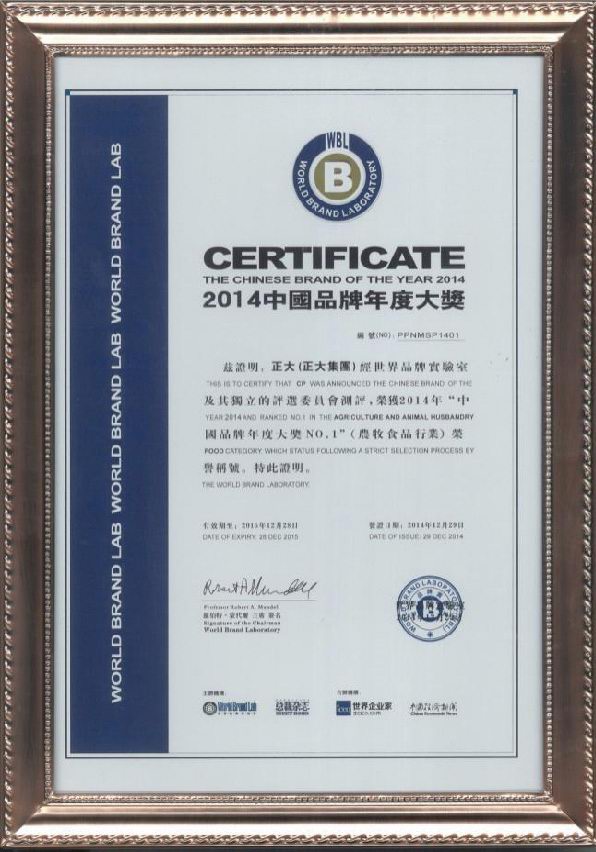 2014年12月29日,“總裁世界年會”在北京東方君悅大酒店舉行。本次大會揭曉了享有“中國品牌奧斯卡”之稱的 “世界品牌實驗室2014年中國品牌年度大獎”評選結(jié)果,正大集團、中國國航、國家電網(wǎng)、騰訊控股、中國人壽、中國國旅、北汽集團、華為技術(shù)、長虹電器等30個活躍在中國經(jīng)濟舞臺的領(lǐng)軍品牌榮獲 “中國品牌年度大獎”,正大集團以在農(nóng)牧食品業(yè)多年的探索實踐和管理經(jīng)驗,以及良好的產(chǎn)品品質(zhì)和品牌知名度,榮獲農(nóng)牧食品行業(yè)“中國品牌年度大獎***”榮譽稱號。哈佛商學院教授約翰?戴騰博士(John Deighton)、耶魯大學管理學院教授萊維·多爾博士(Ravi Dhar)分別進行頒獎及致詞。