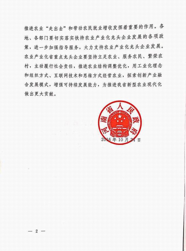 農(nóng)業(yè)產(chǎn)業(yè)化省重點(diǎn)龍頭企業(yè)2016.10.24